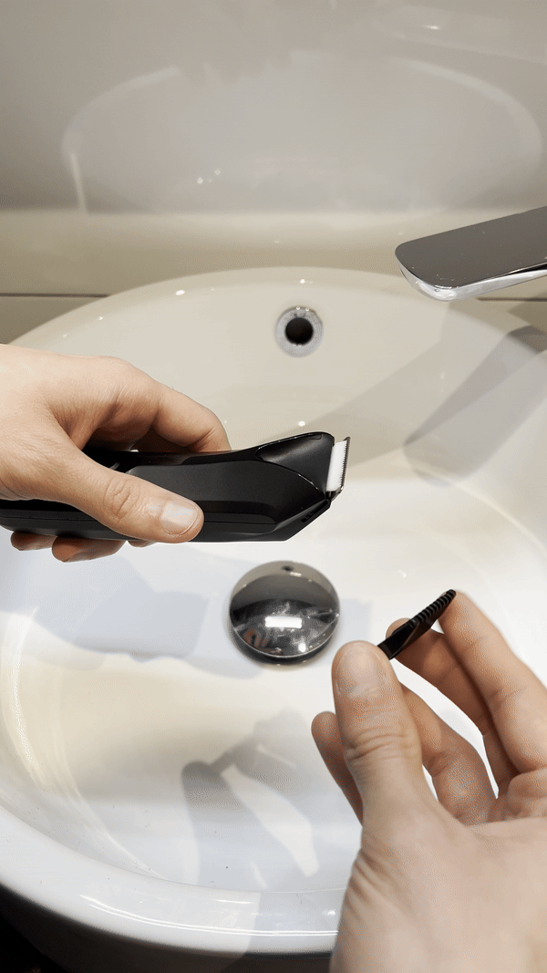 Start by removing the blade head, then use the brush included in your package to clean the blade and trimmer. After brushing off the blade and trimmer, rinse both under running water and allow to dry. Once they are dry, you can put the blade back on your trimmer.